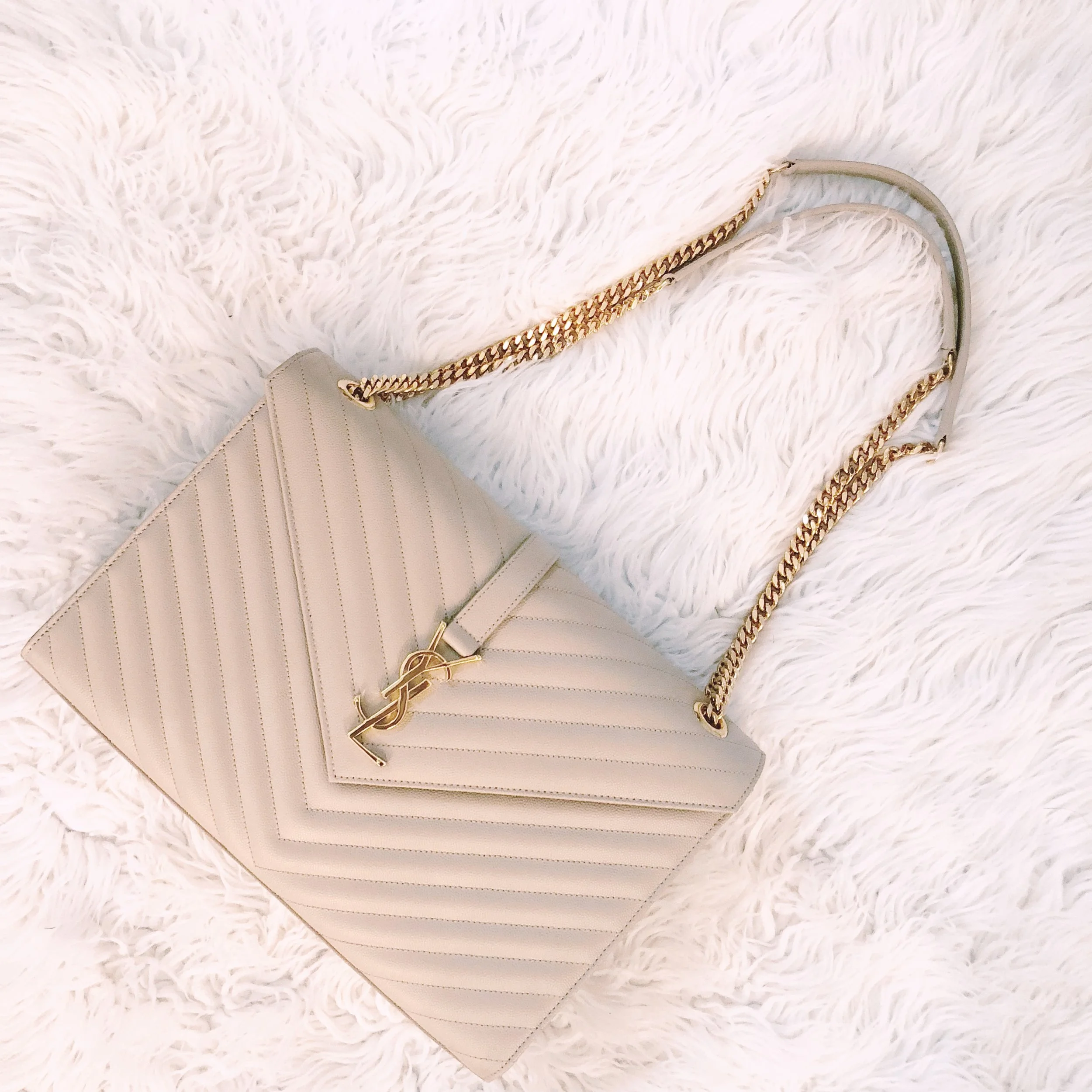 This Saint Laurent bag has been by my side since the day I received it for my birthday. It's called the Nude Blush Saint Laurent Monogram Matelasse Bag. It has such a sophisticated look to it and I love the fact that it goes with anything I wear. A definite must-have! Added bonus? My computer fits inside this bag!